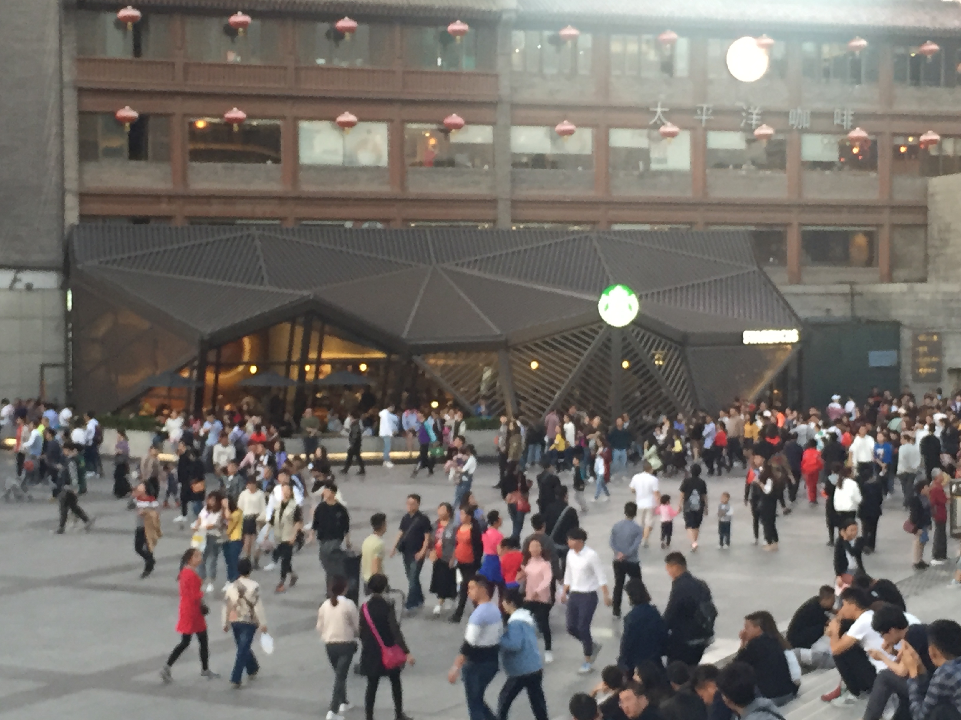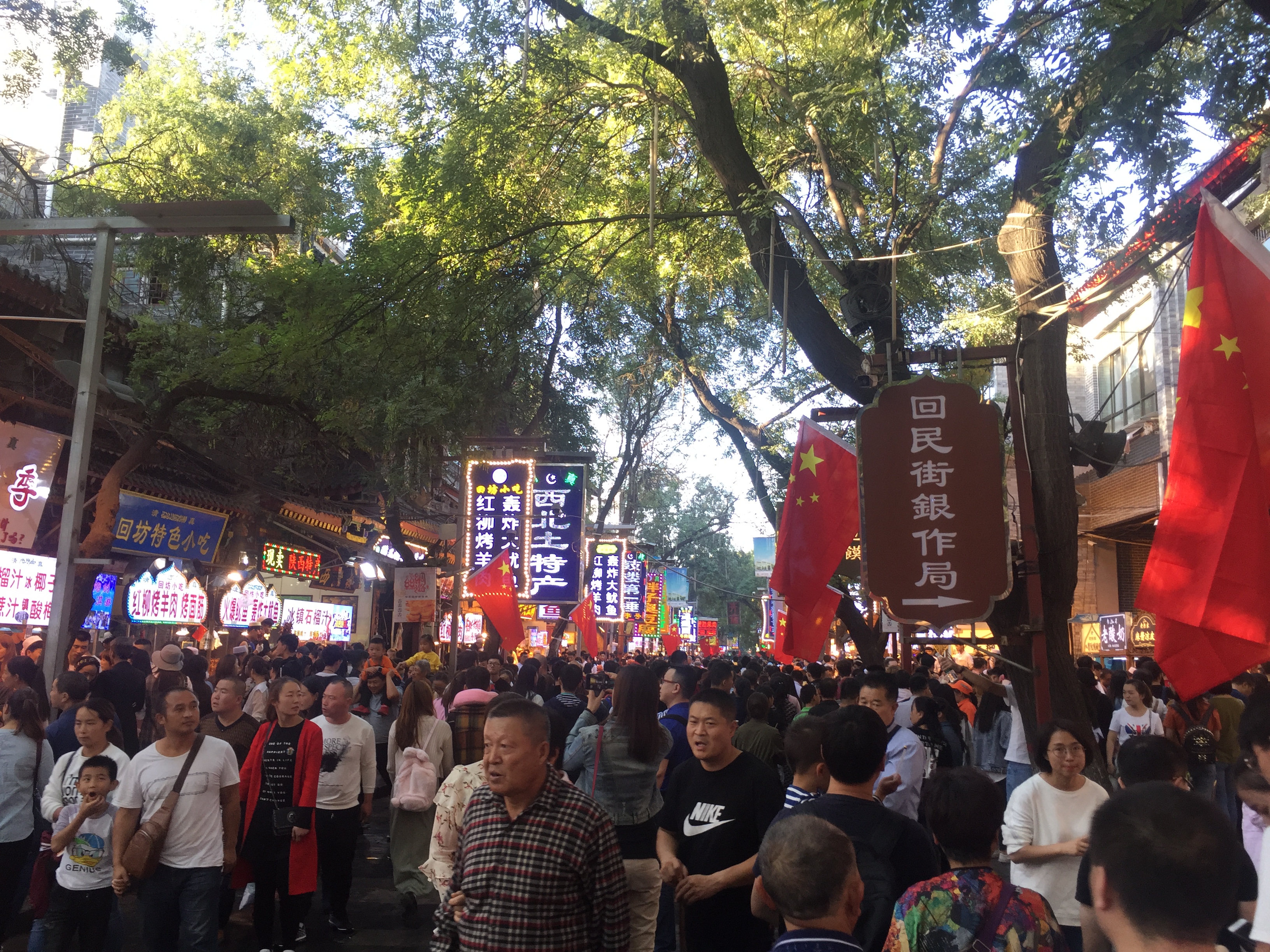 오후 세 시가 넘어서, 다시 숙소로 들어가서 쉬었다가 해가 기울기 시작할 무렵 다시 나왔다. 이번에 향한 곳은 회족 거리인 후이민제이다. 사실 거리의 대부분이 먹을것을 파는 곳이다. 그런데 이 날은 10월 1일, 무려 국경절의 첫날이었던 것이다. 국경절과 춘절 연휴에 중국이 어떻게 돌아가는지 뉴스로 접하기만 해서, 이렇게까지 사람이 많을 줄은 몰랐다. 길을 걷는 것부터가 출근시간 지하철 환승통로를 방불케 하고, 뭐 하나 사먹고자 하면 사람들을 뚫고 지나가야 했다. 뭐 여튼 값진 경험이긴 했으니 그걸로 된 건가? 후이민제 옆에는 시안의 중심 종루가 있고, 아름답기로 소문난 스타벅스도 하나 있다. 스타벅스에 들어가는 것부터 사람이 너무 많아서 실패했다. 종루 내부도 올라가려면 줄을 오래 서야 해서 포기했다.