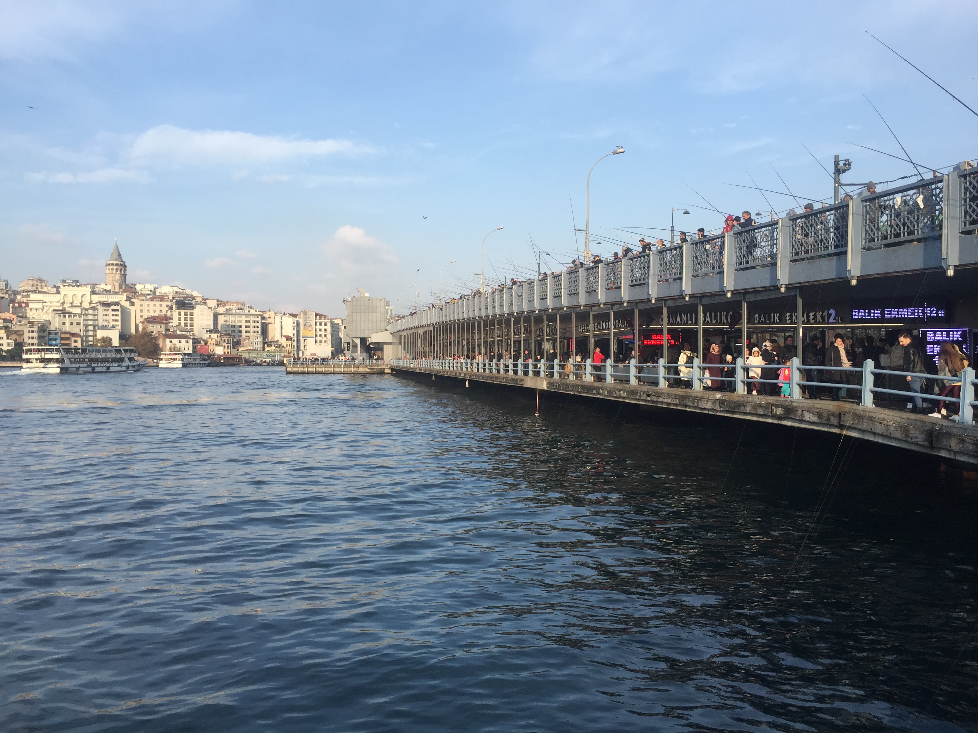 갈라타 다리에는 세월을 낚는 낚시꾼들이 일년 내내 가득하다. 갈라타 다리 위층에는 낚시꾼들이 빼곡히 있고 아래층에는 흔히 고등어 케밥이라고 한국인에게 알려져 있는 발륵 에크멕 (balık ekmek - 물고기 빵이라는 뜻)을 파는 음식점들이 있었다. 나는 나중에 한국인에게 매우 유명한 에민 아저씨 집에 가기 위해서 여기서는 먹지 않았다. 다리 끝의 광장에는 홍합 돌마를 파는 노점과 프레첼 비슷한 빵인 시미트를 파는 노점이 있었다. 홍합 돌마는 안 먹어봤지만 시미트는 정말 고소하고 맛있었다.