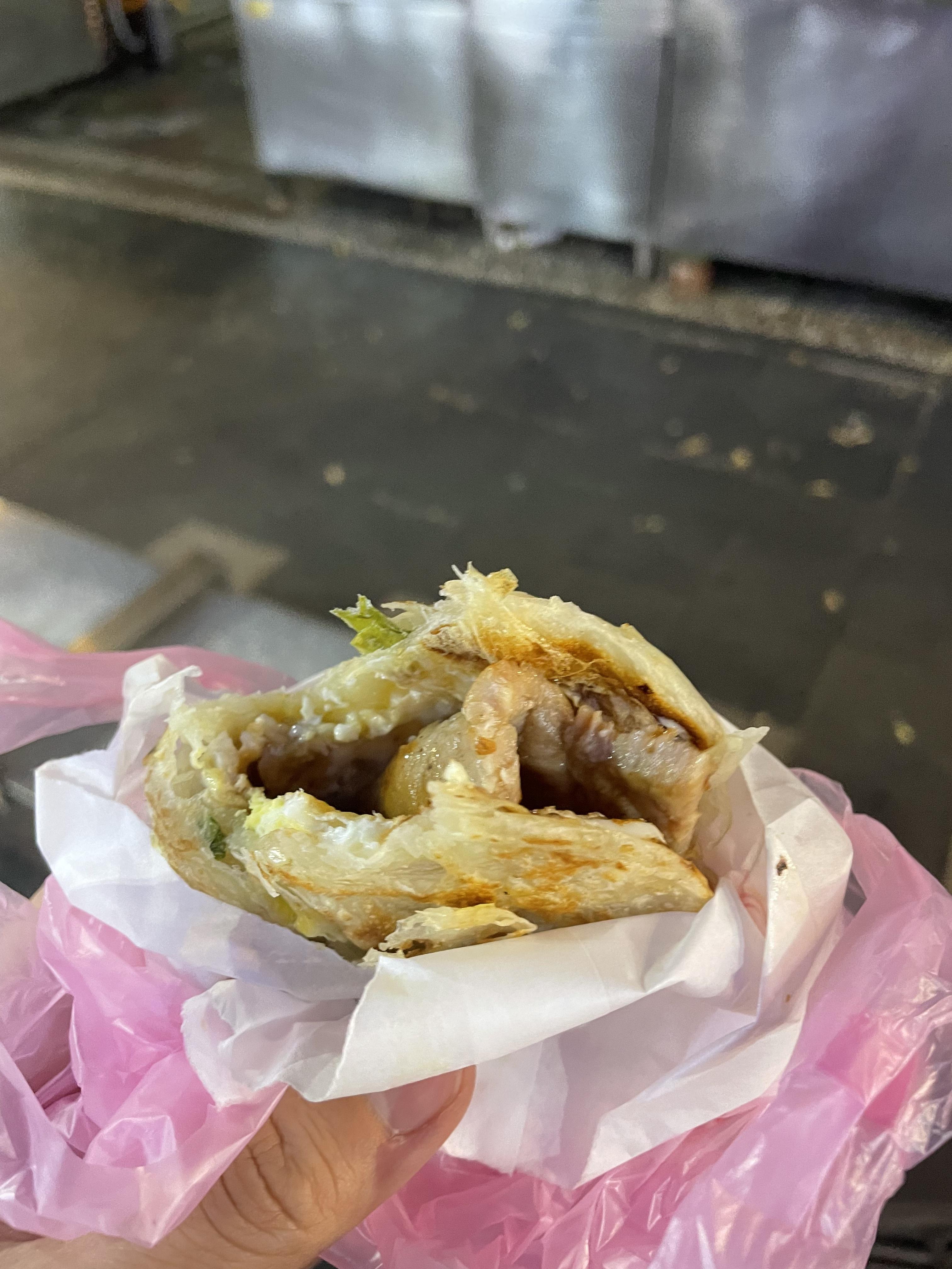저녁을 먹었는데도 뭔가 아쉬워서 다시 나와서 음식 가판대를 찾았다. 마침 또 대만의 명물 총좌삥 (蔥抓餅)을 파는 곳을 발견해서 얼른 사먹었다. 한자 그대로 파를 넣은 전병을 손으로 잡아 먹어서 이런 이름이 붙었는데, 예전에 칭다오에서 먹었전 젠빙과도 유사했다. 속재료를 본인 취향대로 선택할 수 있었는데 돼지고기 구운 것을 넣었다. 다른 것도 넣어서 먹어보고 싶었지만 일단 밤이 늦었기에 다음날 예스진지 투어를 위해 쉬기로 했다.