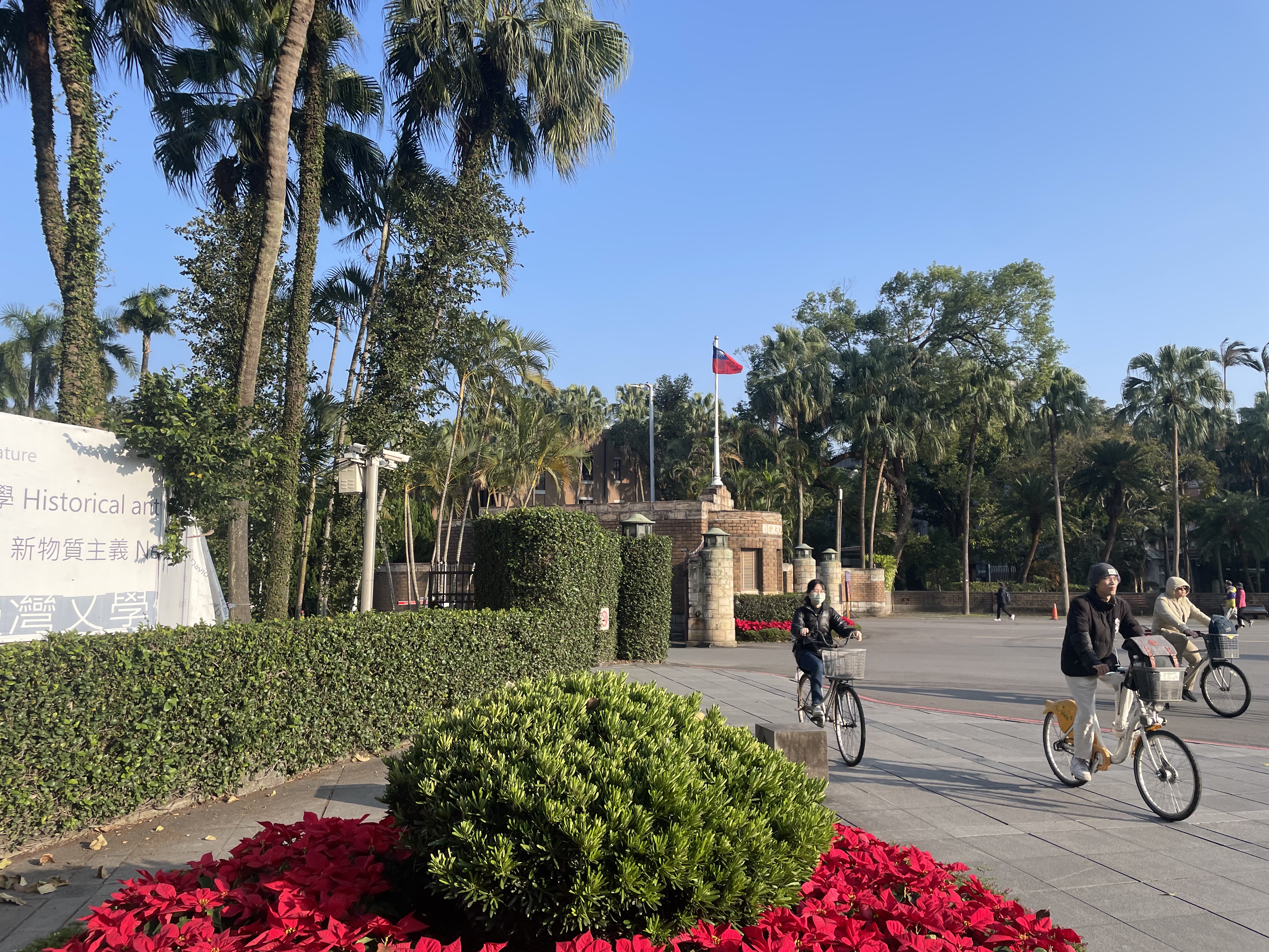 대학의 첫인상을 나타내는 정문. 서울대의 '샤' 대문이 대학의 상징으로 자리잡을 정도로 유명한 것에 비해서, 여기의 정문은 그렇게까지 인상적이지는 않았다. 아열대 지방임을 자랑하기라도 하듯 정문 주변으로 잔뜩 심겨져 있는 야자수는 한국에서는 보기 힘든 것이긴 하다. 대만이라는 정체성을 잊지 않고 싶은지 정문에 대만 국기가 우뚝 솟아있었다.